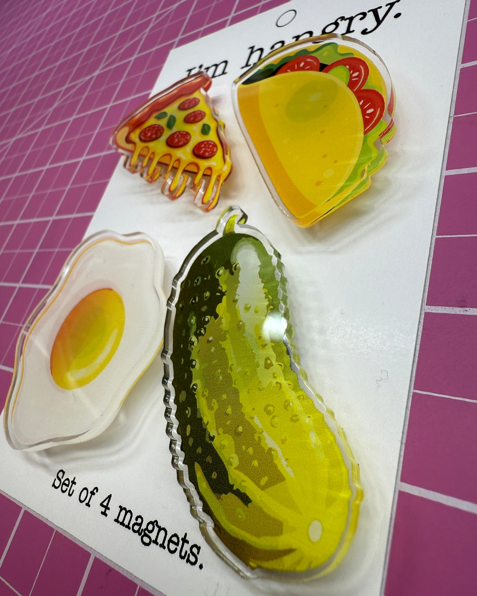 This set includes four super-strong magnets. Each design is UV printed on 1/8" thick material.